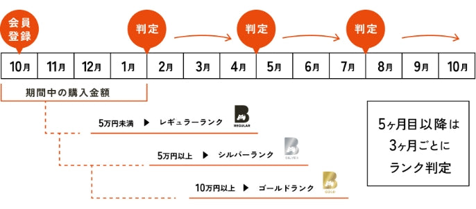 新規会員さまのみ会員登録月を含む4ヵ月間の合計金額が、最初のランク判定時の金額となります。2回目以降は3ヵ月経過後の月末にランク判定をいたします。
